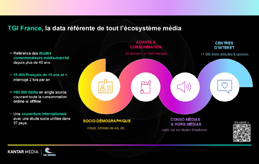 L’étude consommateurs média-marché TGI France est une référence incontournable pour décrypter les comportements, les attentes et les habitudes des Français de 15 ans et plus. TGI France, c’est plus de 60 000 items analysés, offrant près de 4 milliards de combinaisons pour explorer le marché français sous toutes ses facettes.
