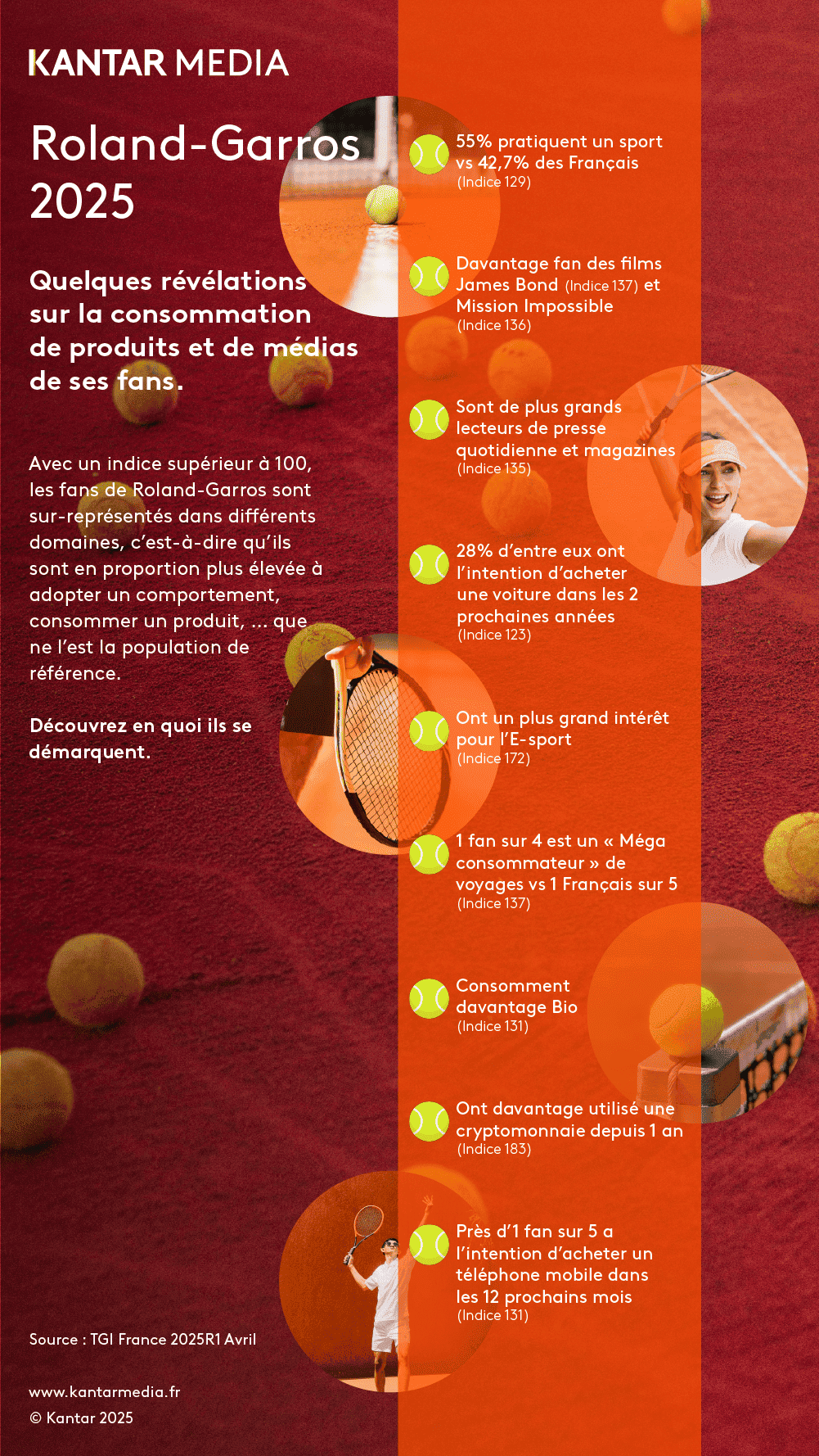 Au-delà du divertissement, les fans de Roland-Garros adoptent des comportements de consommation singuliers, parfois en avance sur leur temps. Nombreux sont ceux qui envisagent l’achat d’un nouveau téléphone mobile dans un futur proche. L’usage des cryptomonnaies est également bien plus répandu chez eux que dans le reste de la population.